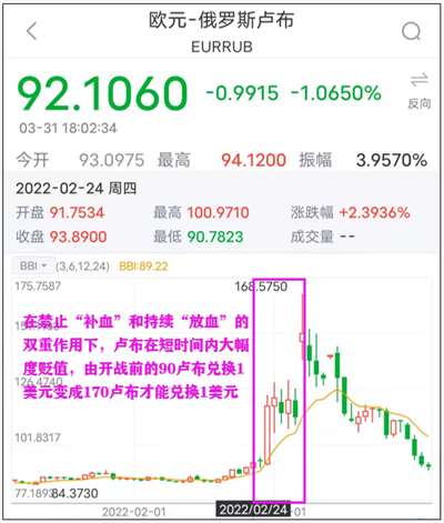 大家看下面的图:在禁止“补血”和持续“放血”的双重作用下,卢布在短时间内大幅度贬值,由开战前的90卢布兑换1美元变成170卢布才能兑换1美元。