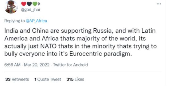 这让非洲人民一头雾水,有人拿出一张非洲殖民图,欧洲国家遍地开花,怎么不见中国和俄罗斯?还有人嘲讽又是欧美中心论那一套,沉默的才是大多数吧。