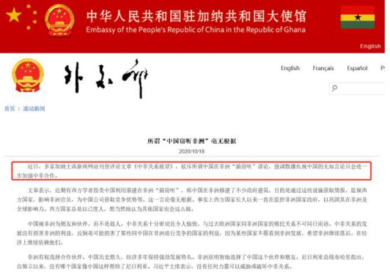 但这事不仅遭到中国驻加纳共和国大使馆驳斥,多家加纳主流新闻网站同样也刊登评论文章《中非关系展望》,声援中国。