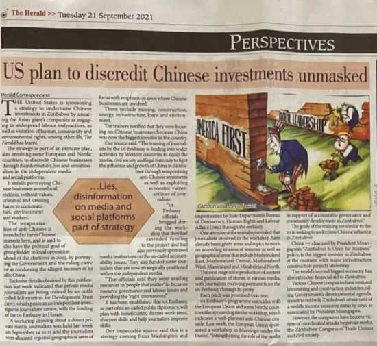津巴布韦官方纸媒就揭露了一则美国驻津大使馆的丑闻。它竟然以每篇文章1000美元(约合人民币6438元)的价格收买记者等文字工作者。让这些人从各个角度抹黑中国在津巴布韦的投资,进而激怒当地不明真相的群众去破坏中津合作。