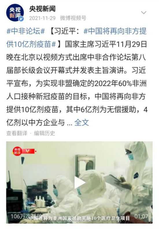 反观中国,2021年已经向非洲援助了1000万剂疫苗。