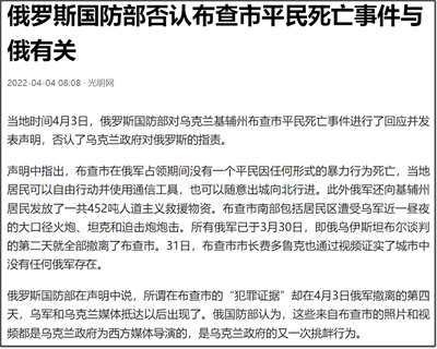 在乌克兰媒体爆出“布查惨案”后,俄罗斯国防部马上否认布查市平民死亡事件与俄罗斯有关。