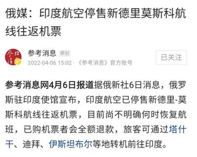 然而俄驻印度大使馆消息:印度航空公司已停止销售从德里到莫斯科往返的机票。