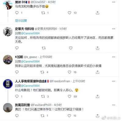 然而,这次的煽情表演并没有收获预期中的一呼百应的效果,冯德莱恩的推特还被网友们骂到当场大翻车:有人批评冯德莱恩拙劣的演技,有人批判西方媒体配合乌克兰制造肮脏的谎言,有人指责乌克兰把尸体当成景点各种摆拍。