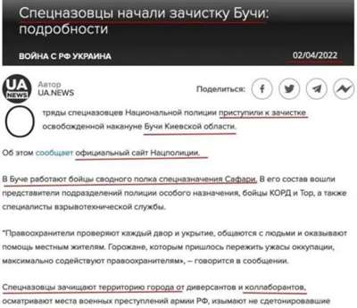 乌克兰国家警察局网站(npu.gov.ua)4月2日发布新闻称:“乌克兰国家警察开始清理(зачистку)布查,特种部队清除了城市里的破坏者和与俄罗斯军队的勾结者。”