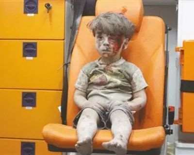 “白头盔”组织称奥姆兰刚刚被他们从一场由叙政府制造的炸弹袭击中救出,美国国务院称这个孩子是叙利亚战争的“真正面目”。