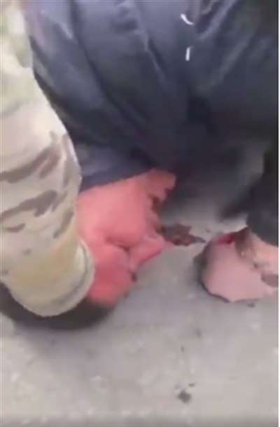 还有一段视频显示,一群胳膊上有蓝色标志的乌克兰士兵,对一群手无寸铁的平民拳打脚踢,胶带绑手,脚踩脑袋,还砸了人家的车从车里翻找食物,因为这些难民领了俄军的食物,就被认为是通俄分子,往死里打。