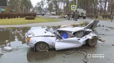 一具尸体在布查街头被损毁的汽车中被发现。图:乌克兰国家警察公布
