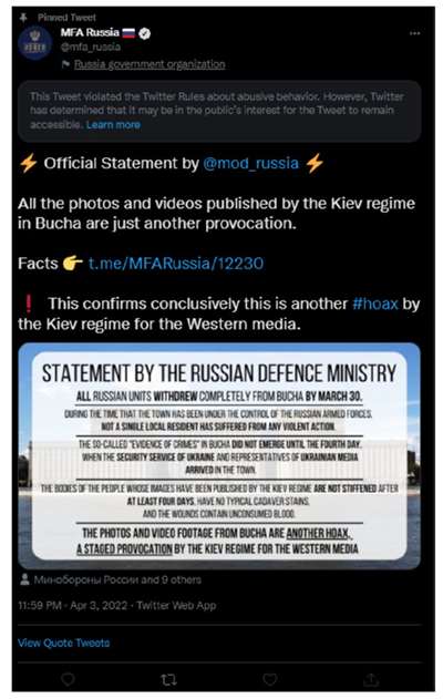俄外交部在社交媒体推特上发布声明,但立即被推特屏蔽