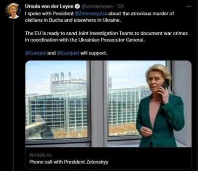 欧洲委员会主席乌尔苏拉·冯德莱恩称:“对俄罗斯撤出地区时发生难以形容的恐怖事件之报导感到震惊。迫切需要进行独立调查。战争罪行的肇事者将被追究责任。”
