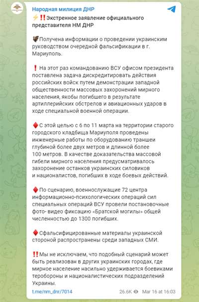 早在上个月16日,“顿涅茨克共和国”军方在其Telegram账号发布紧急声明称,已收到关于有关乌克兰领导人在马里乌波准备一场“伪造行动”的情报。
