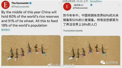 英国《经济学人》4月9日在抱怨中国拥有全球60%的大米储备和51%的小麦储备,而中国的人口只占全球18%。