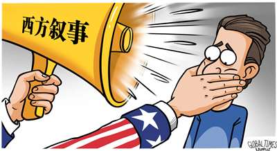 ▲ 所谓的“西方叙事”和“言论自由”,实质上却是编织虚假叙事和封杀不同声音。(漫画|刘蕊)