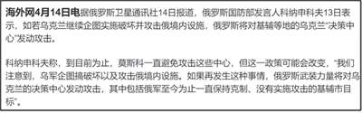 不过实际上,在4月14日俄罗斯本土居民楼被乌克兰袭击后,俄罗斯国防部就表示,俄方注意到乌克兰军队对俄领土上的目标进行破坏和攻击。如果这种行为持续,俄军将打击做出这些决策的地点,包括基辅。