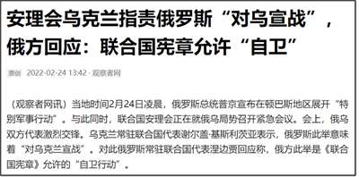 所以,当时关于宣战之说,是乌克兰方面对俄罗斯的指责,但俄罗斯并不认为自己是宣战,俄罗斯在2月24日的时候,还表示“特别军事行动”是联合国宪章允许“自卫”。