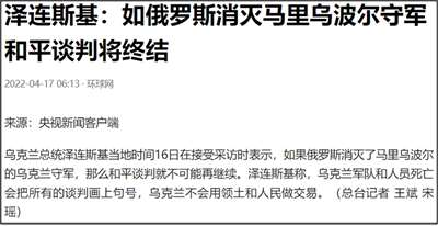 泽连斯基在16日接受采访时表示,“如果俄罗斯消灭了马里乌波尔的乌克兰守军,那么和平谈判就不可能再继续。”