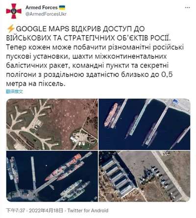 昨天上午,一个名为“Armed Forces Ukr”的推特账号最先发布一组图片称,“谷歌地图开放访问俄罗斯的军事和战略设施。”