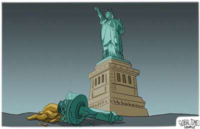 ▲ 美国以“民主灯塔”自居,却始终无法正视自身的“民主赤字”及美式民主千疮百孔的现实。(漫画 |刘蕊)