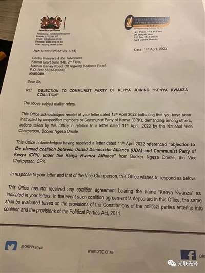 一位肯共成员致函政党办公室反对加入肯尼亚宽扎联盟,得到了回信