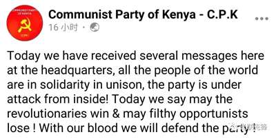 现在可以确定的是,肯共将不会加入肯尼亚宽扎联盟。这一点现在已经得到证实。其官方账号也发布消息,指出整个事件是“来自内部的攻击”,表示“革命必胜,机会主义必败!”“我们将用鲜血来捍卫我们的党”,得到了大量的支持和声援。