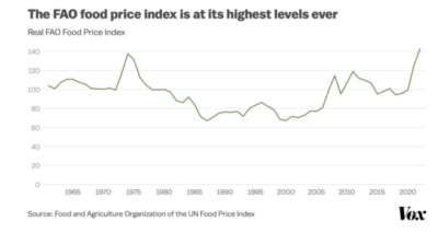 根据联合国粮食与农业组织(FAO)近期的数据,全球粮食价格目前处于自1990年以来的最高水平。目前全世界约有8.87亿人正面临粮食不安全问题,每个月还将会有数千万人加入这一群体的行列。如果无法填补缺口,最依赖俄罗斯与乌克兰粮食进口的欠发达国家的民生甚至政治稳定都将受到很大影响。