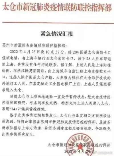 据报道,太仓与上海两地通勤一直处于暂停状态,经太仓疫情防控指挥部研究,考虑到事发突然,特别允许上述人员进入太仓,采用“14+7”健康管控措施。