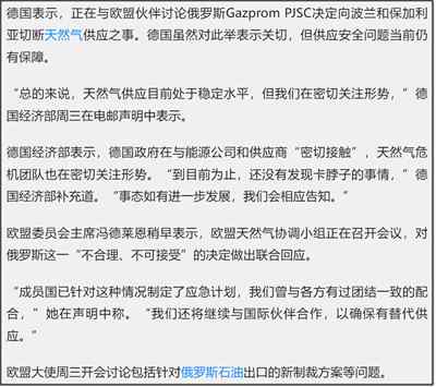 由于4月1日开始供应的天然气是在4月下旬或5月结算,所以外界之前也普遍预计,要到4月底才会出现俄罗斯对欧洲天然气断供的事情。