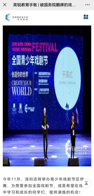 英锐国际教育集团还进一步把现代戏剧、音乐剧教育的大网撒在了我国公、私立学校的英语及戏剧教学,宣称戏剧教育无国界,用谎言令人脑残。