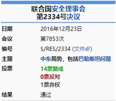 2016年12月23日,安理会表决通过第2334号决议,该决议指出,以色列在占领的巴勒斯坦领土上的定居活动是“公然违反”国际法的,并且“没有法律效力”。决议要求以色列马上停止这种活动并履行日内瓦第四公约中规定的占领国的义务。