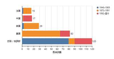 从联合国成立到上个月,共行使269次否决权,从多到少排序依次是苏联(俄罗斯)120次,美国82次,英国34次,中国17次,法国16次。