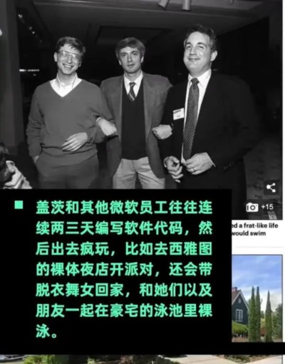 言外之意似乎是,我错了,都怪坏人蒙蔽,我才没看清他的真面目,但我的目的是“为全球健康”筹钱。 先道歉,再甩锅,最后转移注意力,一套流程下来,把自己择得干干净净,俨然一朵盛世白莲。 虽然现在爱泼斯坦死无对证了,但互联网可是有记忆的。 2021年,曾为盖茨撰写过两本传记的詹姆斯华莱士称,盖茨从来就不是一个木讷的“技术宅”,他好色在业内是公开的秘密。 据华莱士爆料,盖茨年轻时就很喜欢参加“狂野的派对”,是“裸体夜店”的常客;在哈佛读书时,经常光顾波士顿情色表演、脱衣舞秀、卖淫集中的红灯区。 即使结婚之后,他出差时还喜欢和报道微软、科技产业的女记者调情,因为“沉迷女色,多次劈腿”,曾与前妻梅琳达分手长达一年的时间。