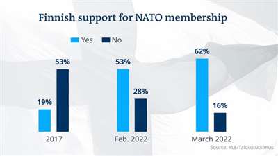 目前,芬兰有74%的人认为俄罗斯是“头号敌人”,62%的人希望尽快加入北约,而去年同期,两组数据均不到20%。
