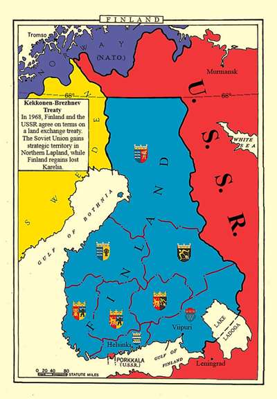 等到了二战结束后,芬兰为了保住国家独立,选择不刺激苏联的外交政策,并在1948年4月与芬兰签订了《苏芬友好合作互助条约》,这份条约得以让芬兰在冷战中成为中立国。在此后的几十年中,为了和苏联保持良好的关系,芬兰凡事小心谨慎。