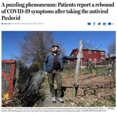 波士顿环球的文章《令人费解:患者服用神药Paxlovid之后出现了反弹现象》,称一些新冠病毒患者在服用辉瑞药物之后出现了反弹,又复阳了。