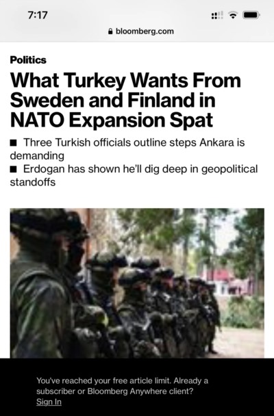 这种情况下,土耳其可以趁机向西方索要筹码。我当时在文章里说,土耳其可以要求加入欧盟为条件,换取放行芬兰和瑞典加入北约。