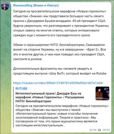 对话结束时,假冒的“泽连斯基”又向小布什介绍了两位“乌克兰战斗英雄”——“沃万和雷克萨斯”。恶作剧二人组随即真人出镜,自称是乌克兰飞行员,击落过多架俄罗斯战机。小布什随即愉快地和他们打招呼,并且说道:“荣耀归于沃万和雷克萨斯,我为你们感到自豪。”