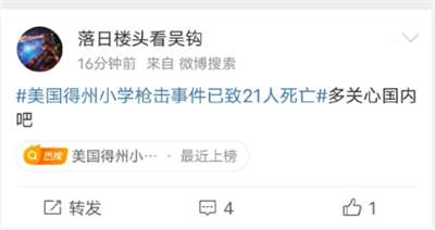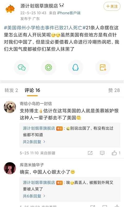 对于中国网民围观美国小学校园枪击惨案,还有账号居然叫嚣什么“大国气度被抹黑了”。