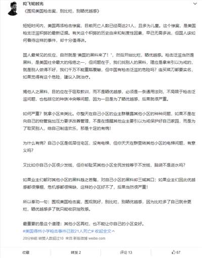 可是,让人想不到的是,对于引发全美强烈关注、美国朝野意见尖锐对立的高发枪击案这一事实,有些“耗材”与“殖人”却心态崩了,不说让美国反思,居然反过来让我们中国人“反思”。