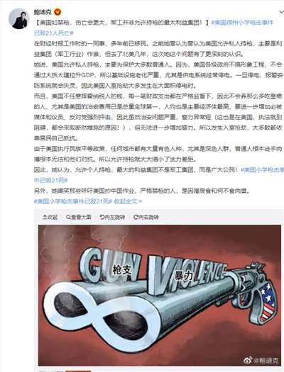 而微博上的有近500万粉的大V则发帖说“美国如禁枪,伤亡会更大,军工并非允许持枪的最大利益集团!”