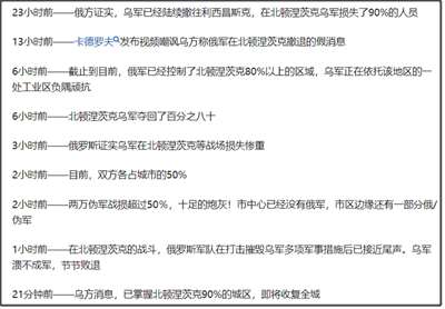 过去24小时,围绕着北顿涅茨克,也是各种真真假假消息满天飞,一会儿是俄罗斯方面说,乌克兰在北顿涅茨克损失了90%人员,议会是乌克兰的消息称,已经掌握北顿涅茨克90%城区,即将收复全城。