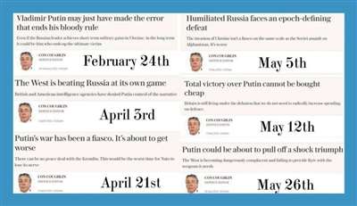 即使是英国《每日电讯报》的防务编辑康·考夫林也无法忽视这一事实,那就是俄罗斯可能会取得胜利。他每周都预言俄罗斯会失败,但他现在声称,莫斯科可能会取得“令人震惊的胜利”,为了维护他的论点,他认为基辅需要更多的武器。