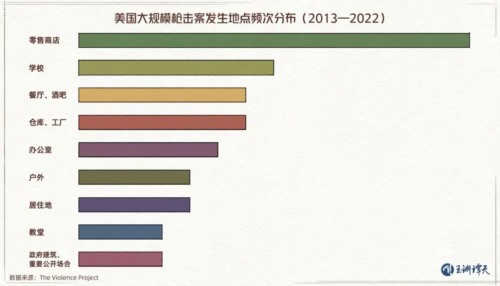 根据美国“暴力项目”(The Violence Project)对2013-2022年美国大规模枪击案案发地统计数据,校园,成为美国大规模枪击案发生频率排名第二的场所,有13.6%的大规模枪击都发生在这里。