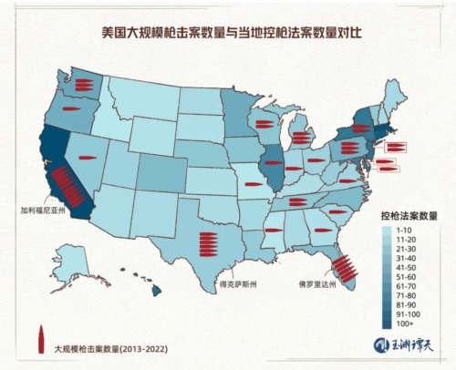 按照人们关于“控枪”的普遍认识,控枪政策越严格的地方,枪击发生率应该也会随之降低。然而,对比分析后,谭主发现:加州也是美国2013年-2022年间发生大规模枪击案最多的州。