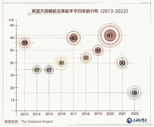 寻着这个线索,我们在统计中,发现了另一个更加令人震惊的趋势——全美范围内,美国大规模枪击案凶手的平均年龄,在2022年已经下降到了18岁。