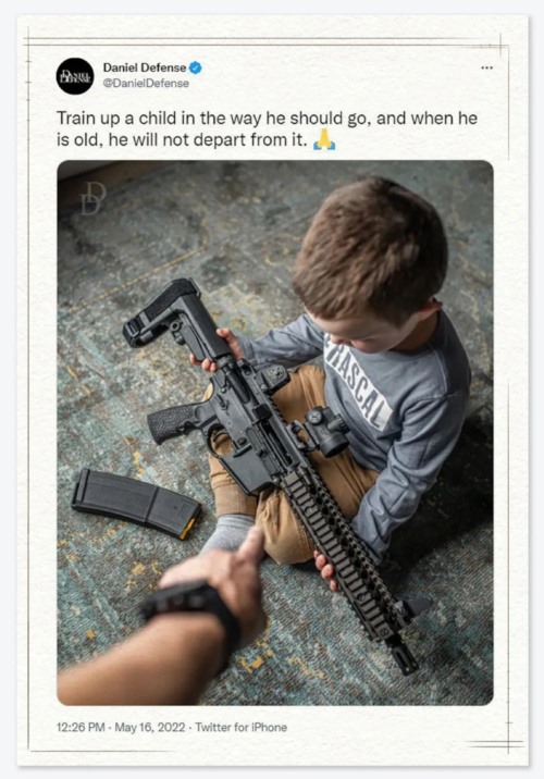 ▲ 5月16日,罗布小学枪击案凶手拉莫斯购枪的前一天,丹尼尔国防在推特发布步枪广告。图片中,幼儿手持步枪,配的广告词是:“训练一个孩子,让他走自己应该走的路,等他长大了,他就不会离开。”
