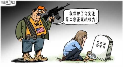 ▲ 美国步枪协会(NRA)面对如此频繁的枪击惨剧,仍以捍卫宪法第二修正案为幌子,不肯在控枪问题上退让半步。(漫画 | 刘蕊)