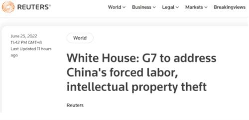 据路透社发自美国空军一号的报道,在拜登前往德国途中,白宫方面宣称,G7将讨论中国所谓“强迫劳动”和“窃取知识产权”问题。