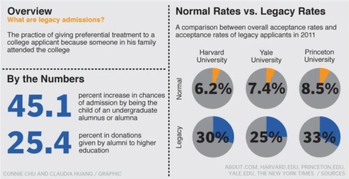 美国大学有一个明规则,叫做“继承录取”(Legacy Admit),说白了就是圈内人优先制,有点“任人唯亲”的意思。