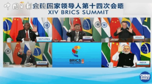 ▲2022年6月23日,金砖国家领导人第十四次会晤以视频方式举行,五国领导人在大屏幕上“云合影”。