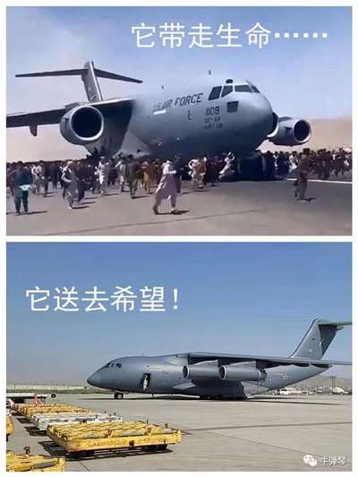 两架军机,时隔不到一年,都出现在喀布尔机场,用一些网友的说法,一架带走生命,一架送去希望。